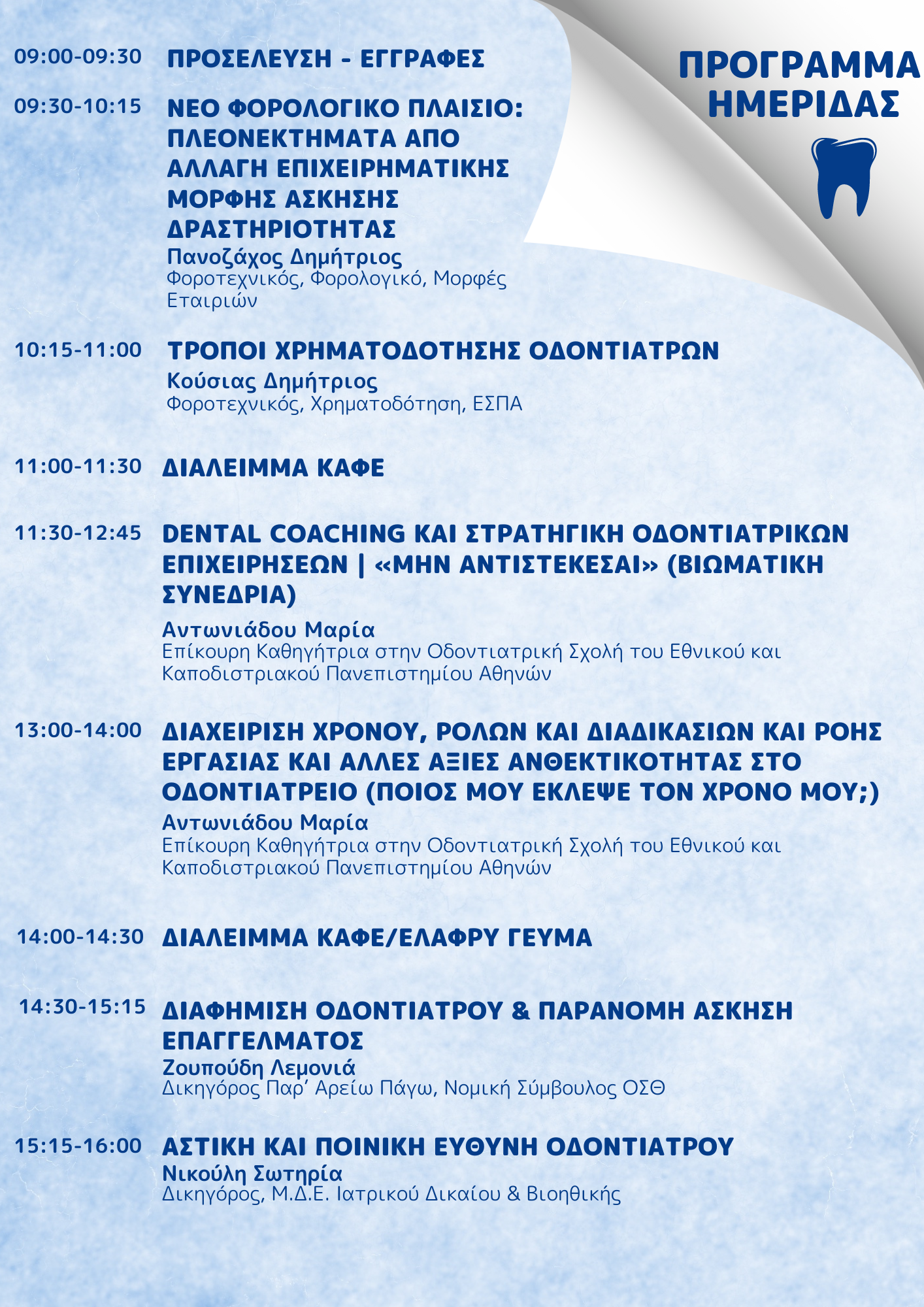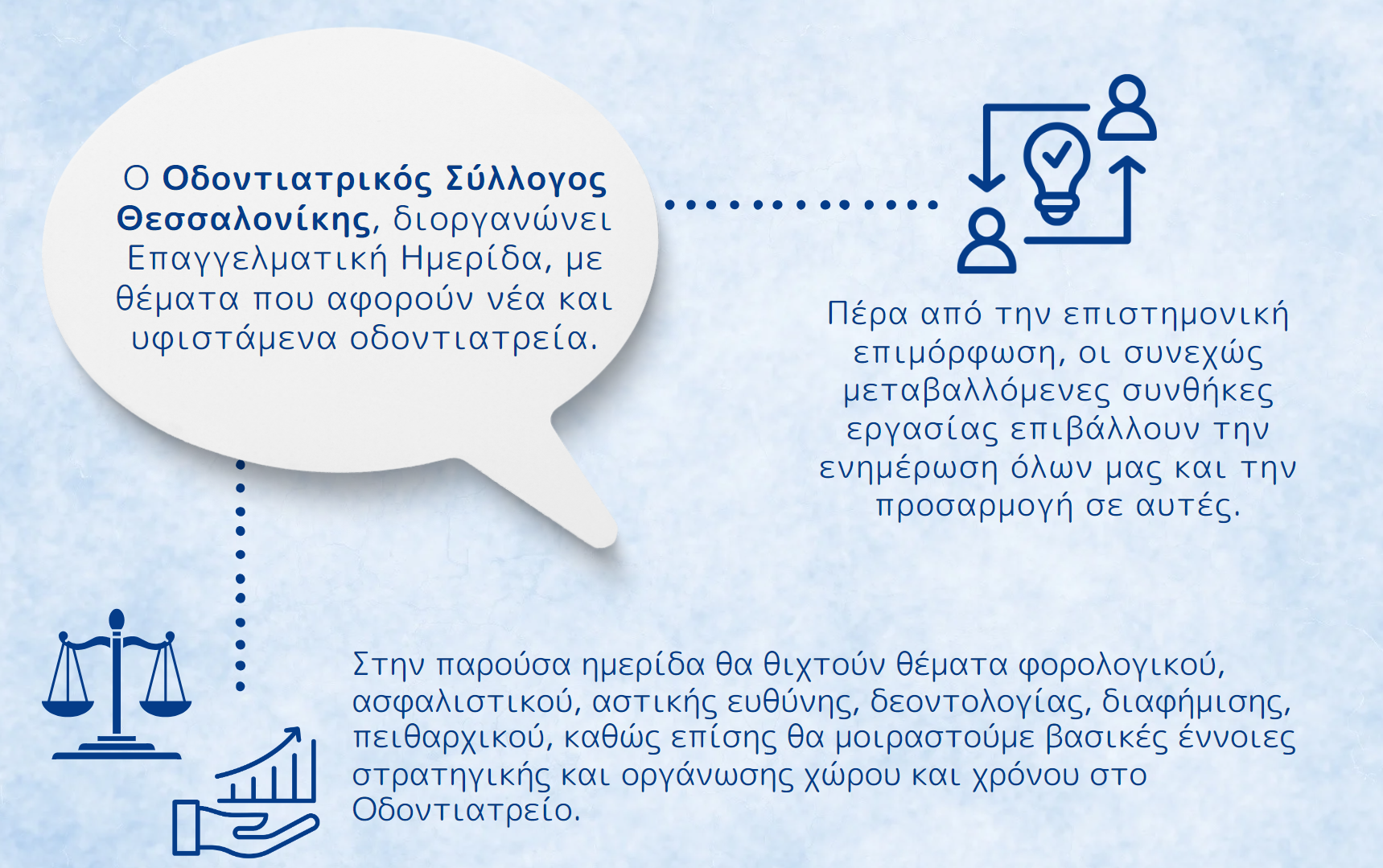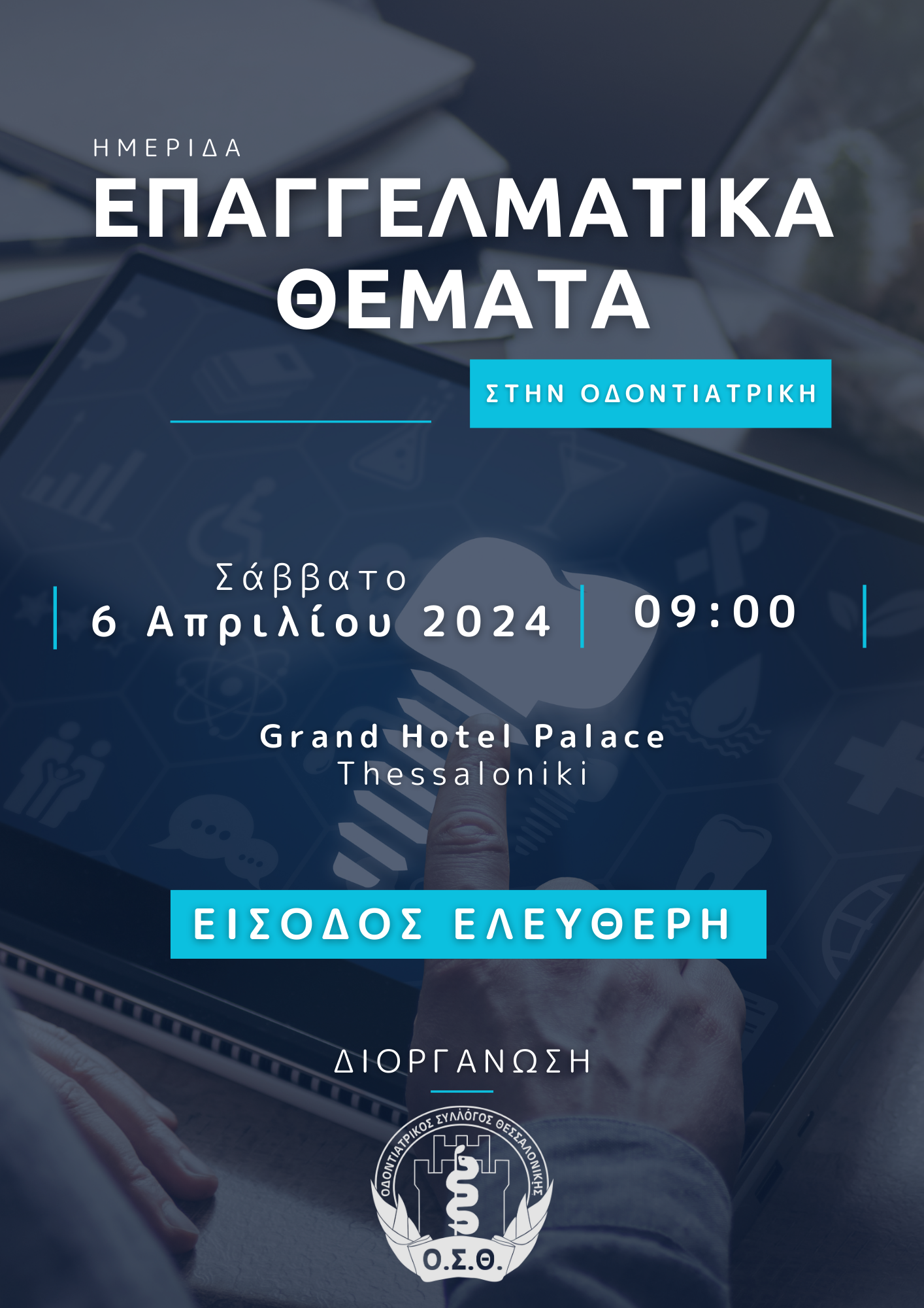 Το Σάββατο 6 Απριλίου στις 9.00, ο Οδοντιατρικός Σύλλογος Θεσσαλονίκης, διοργανώνει Επαγγελματική Ημερίδα, με θέματα που αφορούν νέα και υφιστάμενα οδοντιατρεία. Πέρα από την επιστημονική επιμόρφωση, οι συνεχώς μεταβαλλόμενες συνθήκες εργασίας επιβάλλουν την ενημέρωση όλων μας και την προσαρμογή σε αυτές. Στην παρούσα ημερίδα θα θιχτούν θέματα φορολογικού, ασφαλιστικού, αστικής ευθύνης, δεοντολογίας, διαφήμισης, πειθαρχικού, καθώς επίσης θα μοιραστούμε βασικές έννοιες στρατηγικής και οργάνωσης χώρου και χρόνου στο οδοντιατρείο. Είσοδος Ελεύθερη!