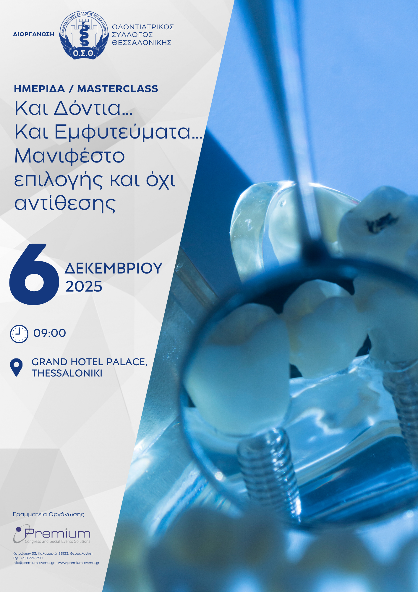 Ο Οδοντιατρικός Σύλλογος Θεσσαλονίκης διοργανώνει επιστημονική εκδήλωση με τίτλο : «Και Δόντια…Και Εμφυτεύματα…Μανιφέστο επιλογής, και όχι αντίθεσης» στις 6 Δεκεμβρίου 2025, στο Grand Hotel Palace. Στην παραπάνω εκδήλωση το θεωρητικό μέρος είναι δωρεάν.