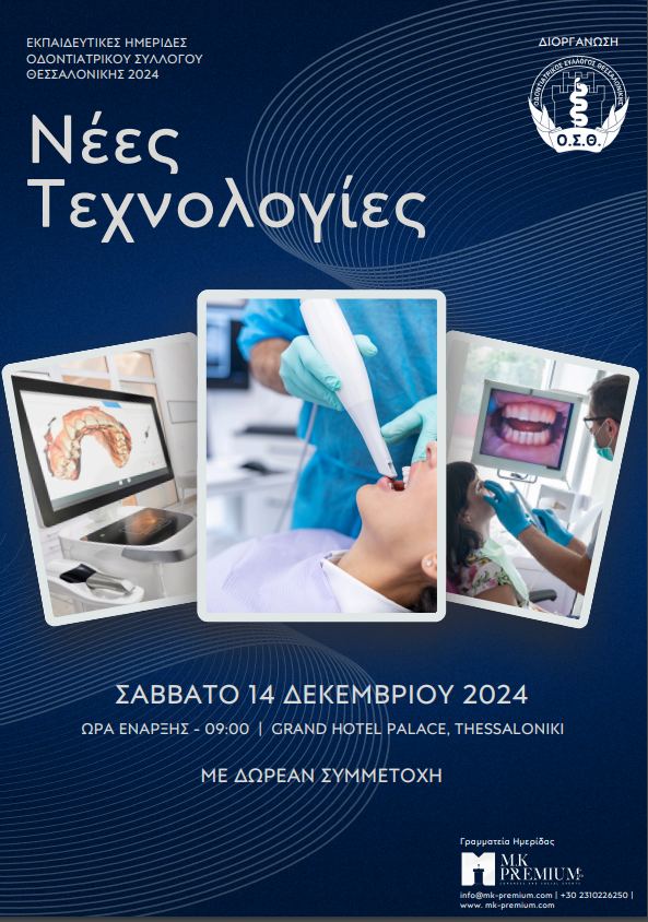 Ο Οδοντιατρικός Σύλλογος Θεσσαλονίκης διοργανώνει επιστημονική εκδήλωση με τίτλο : «ΝΕΕΣ ΤΕΧΝΟΛΟΓΙΕΣ » στις 14 Δεκεμβρίου 2024, στο Grand Hotel Palace