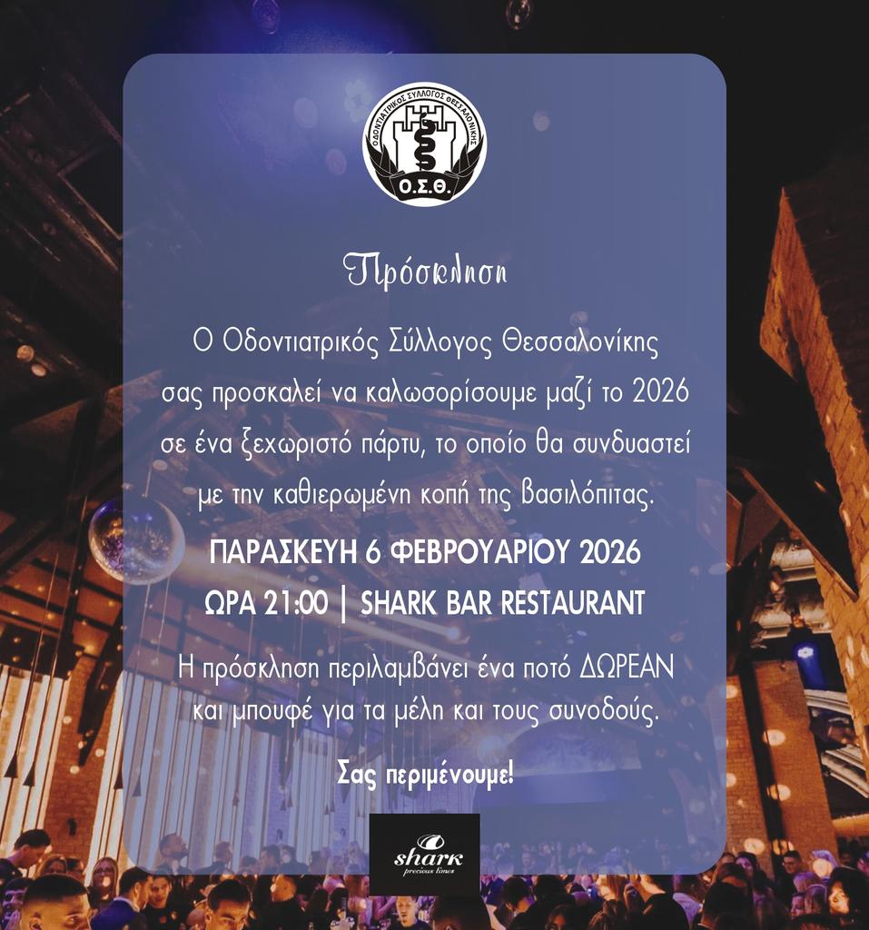 Ο Οδοντιατρικός Σύλλογος Θεσσαλονίκης σας προσκαλεί στην κοπή της βασιλόπιτας για το 2026 που διοργανώνει την Παρασκευή 6 Φεβρουαρίου στο Shark Bar Restaurant!
